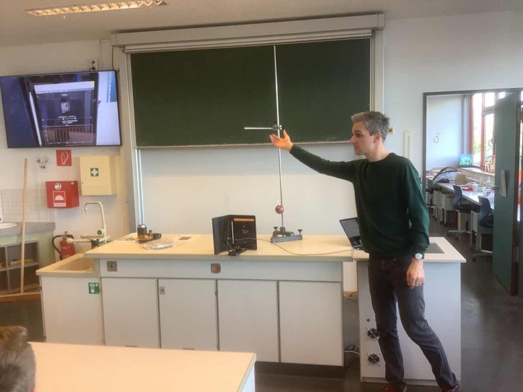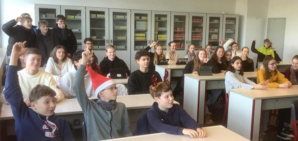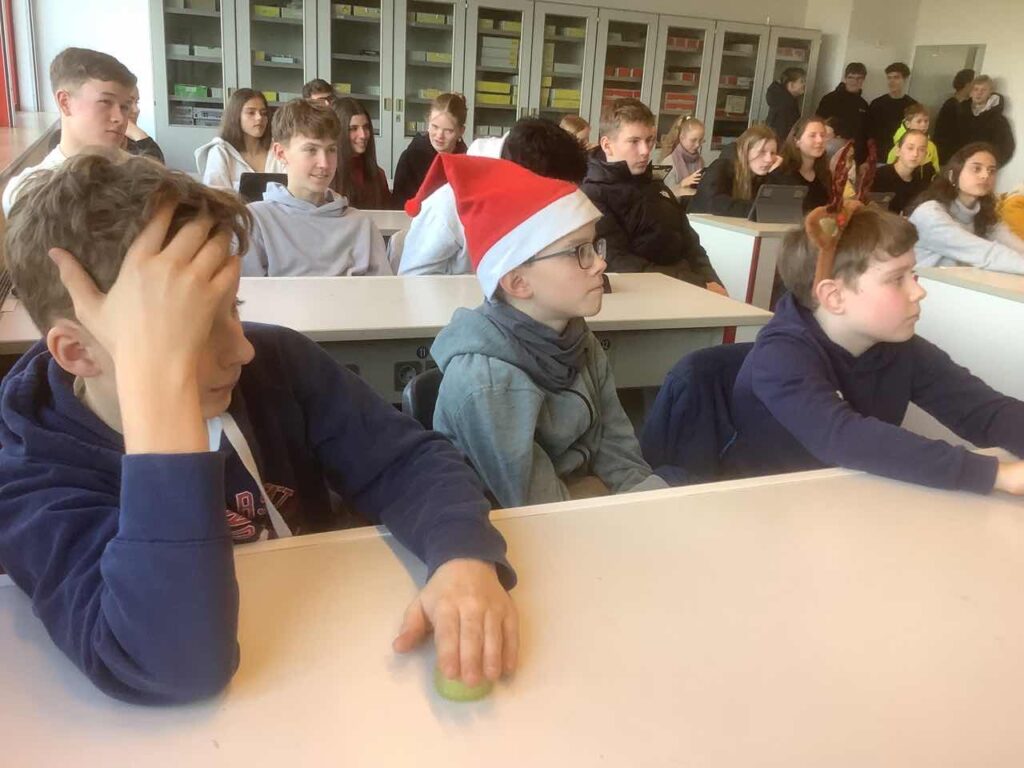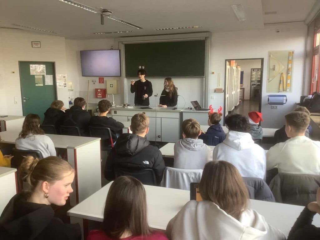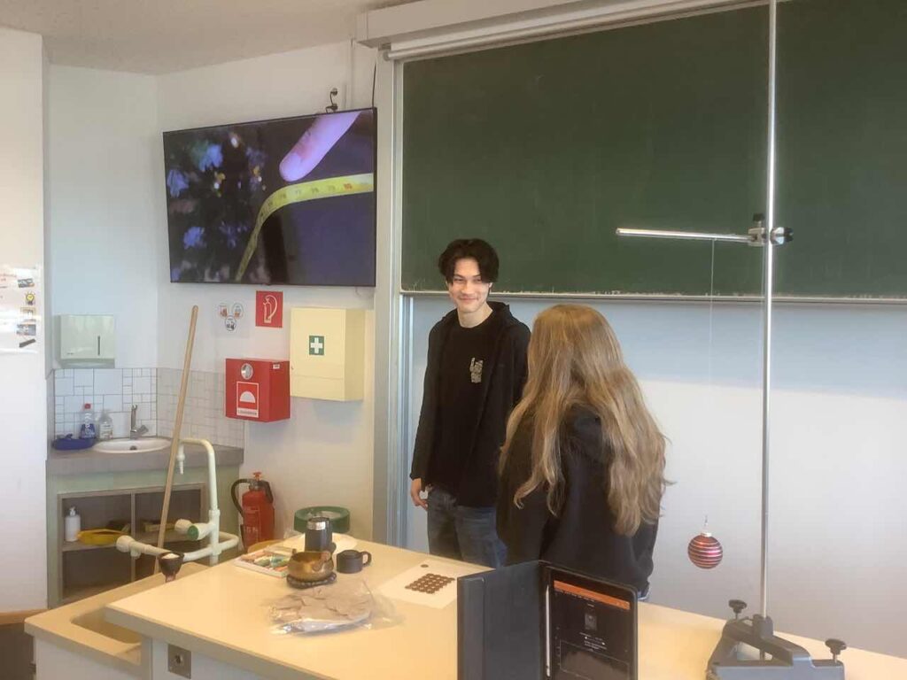 Jeden Tag ein neuer Aha-Moment! In der Adventszeit ist auch in diesem Jahr der große Physikraum täglich in der 2. großen Pause voll neugieriger Blicke und dazugehörender staunender, überraschter, nachdenklicher oder auch diskussionsfreudiger Schüler:innen. Ein kurzer Videoclip, ein verblüffendes Experiment und vier spannende Antwortmöglichkeiten – und schon geht das Rätselraten oder doch eher wissenschaftliches Nachdenken los. So seht ihr zum Beispiel Herrn Jansen eine Weihnachtskugel schwingen während sein Handy den Vorgang genau ausmisst, Herr Zeit kommt extra aus dem Ruhestand ans AvH, um mit einem Schwapp Wasser schwupps einen Gegenstand verschwinden zu lassen und plötzlich tauchen unsere MILeNas auf, die Kaffeeflecken wissenschaftlich untersuchen. „Physik im Advent“ ist ein Wettbewerb und zugleich ein digitaler Adventskalender der Deutschen Physikalischen Gesellschaft in Kooperation mit der Universität Göttingen, der Schüler:innen wie Physiklehrer:innen am AvH bis zu den Weihnachtsferien täglich begeistert.